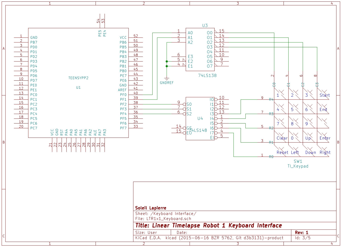 While the Teensy has enough ports available that I could have used an I/O line for each row and column of the keypad, I was trying to keep I/O usage down in aid of using a smaller, cheaper microcontroller in future. Also I did not need to support any simultaneous keypresses for this project, so I used a 74LS138 binary decoder to drive the four column lines from two output bits (port F bits 0 and 1) and a 74LS148 binary encoder to convert the five column lines into three input bits, port F bits 2 through 4. Yes, I know I'm wasting capability on these two chips but there really aren't any more economical selections among standard TTL, and this way there is room to expand the keypad in future.