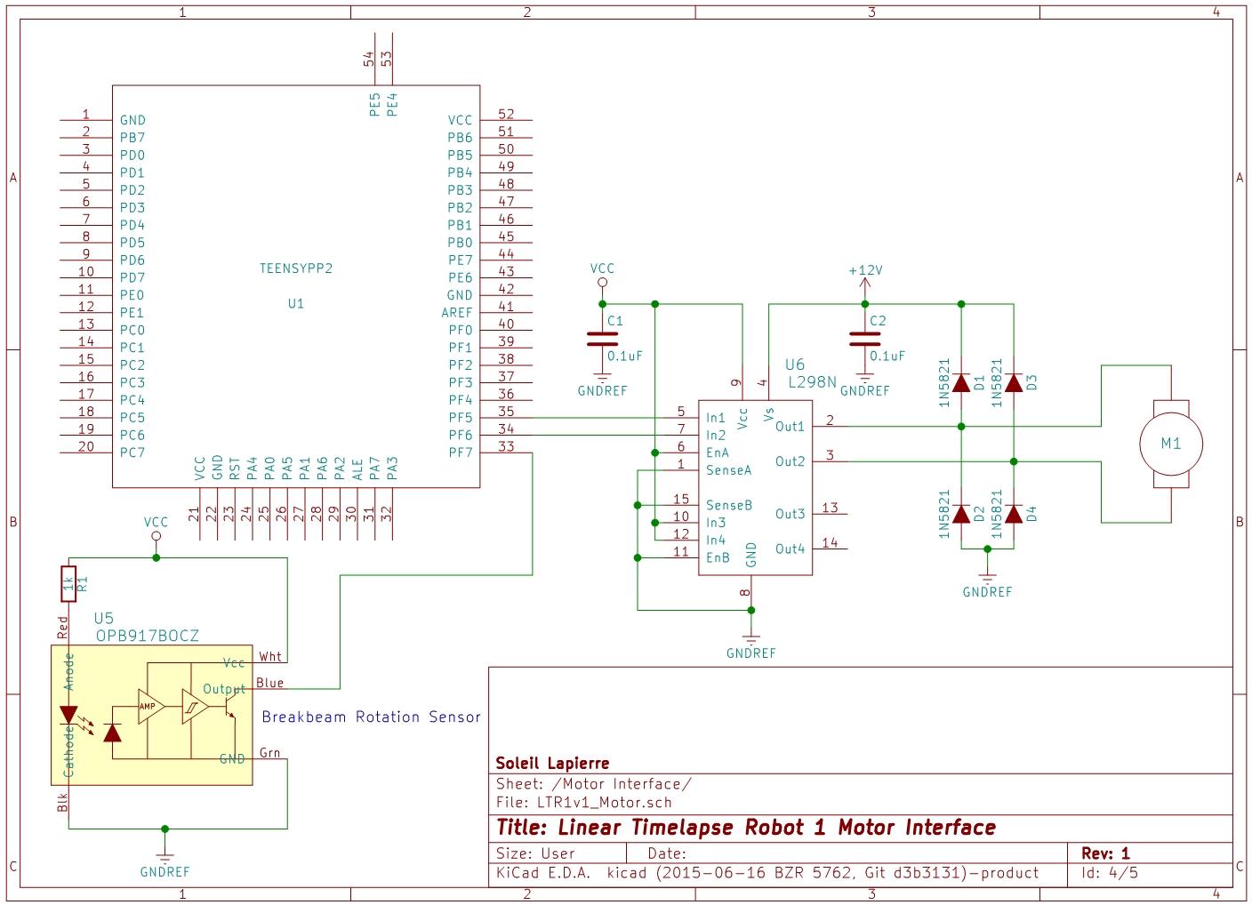 The optical break-beam sensor I'm using is an OPB917BOCZ which was chosen for its physical dimensions (easier to find a fit with my motor mount) and for its TTL compatibility. I actually made a component selection error here and chose a device with an open-collector output by accident, requiring the addition of a pullup resistor to make it logic-level compatible. I should have chosen the non-OC version. The Teensy does have software-selectable internal pullup resistors in its inputs, but they proved insufficient and I had to add an additional 10K pullup resistor to the circuit (not shown).