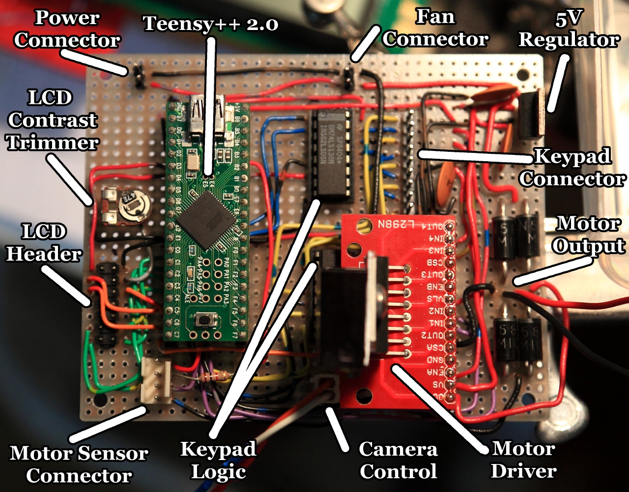The C source code for this project is here if you're interested in looking at it. It's divided up into modules for each I/O subsystem plus some shared code such as the simple state machine I used for both the menu system and the timelapse filming loop. You'd need the Teensy++ 2.0 development tools if you wanted to compile this.