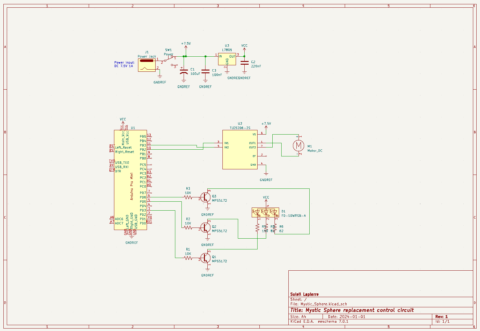 The circuit is really simple. It relies on an external wall-wart power supply providing 7.5 VDC for the motor, and internally regulates that down to 5V for the digital circuitry.
