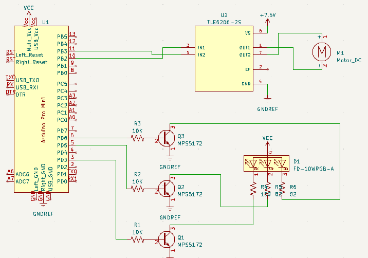 The microcontroller does all the work, outputting PWM signals to control the three colors of the LED and an H-bridge motor driver, which allows reversing the direction of the motor.