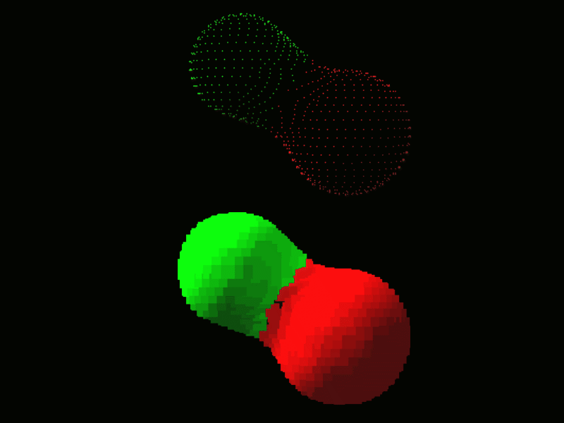 And here's a longer recording using different colors to show the surface points that belong to the different contributing spheres / point soures. In this video I also toggle the rendering mode from voxels to just showing the sample points, and change the detail level.
